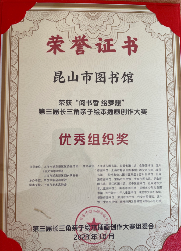 昆山市图书馆获“阅书香 绘梦想”第三届长三角亲子绘本插画创作大赛优秀组织奖