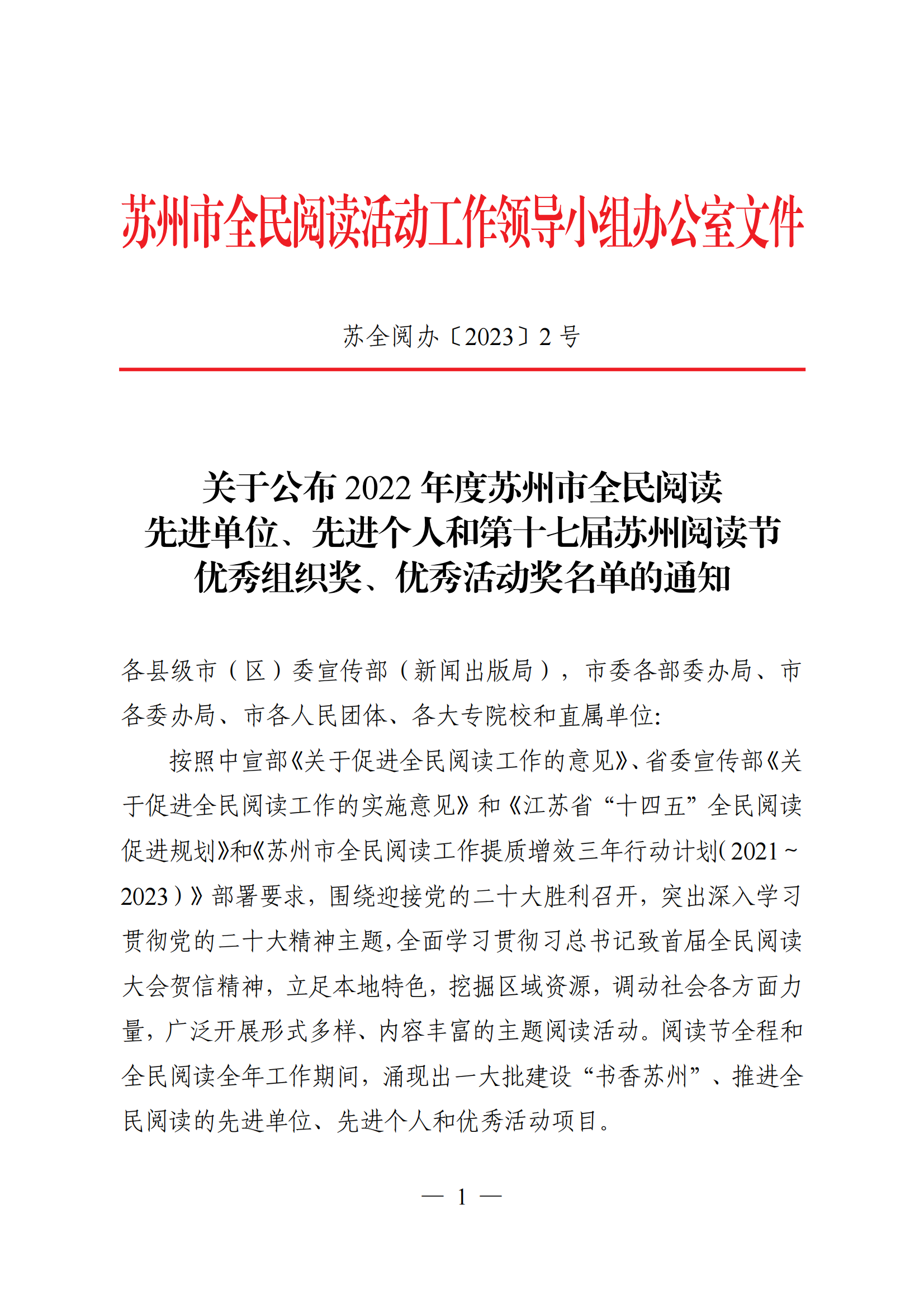 昆山市图书馆喜获苏州市级全民阅读多项荣誉
