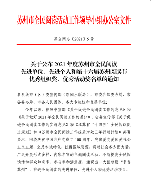 喜报!昆山市图书馆荣获多项苏州市级全民阅读奖项