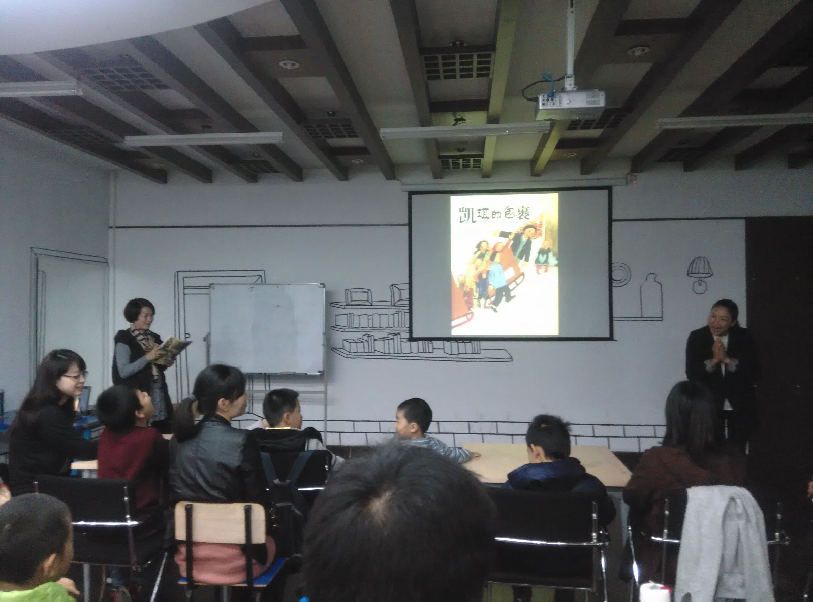 11月20日下午室外阴雨绵绵,昆山市图书馆的读书乐基地温情满泻。在双11妈妈们收到一个接一个的包裹时,在感恩节到来前,小书虫为小朋友们准备了亲子读书会《凯琪的包裹》。
