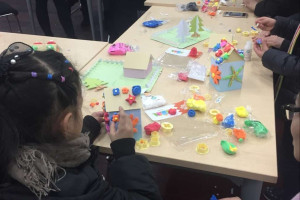 活动开始后,橙子老师先请小朋友们简单说说自己家周围有哪些花并在投影仪上放映出了一些美丽的花卉,接着教大家如何用超轻土制作花蕊、花瓣、花枝,看到老师的演示后小朋友们都迫不及待地准备开始自己动手搭建自己的美丽花世界。活动过程中,小朋友们和爸爸妈妈一起齐心协力,分工明确,你搭房子我做花。孩子们的想象力真是丰富,一朵朵各式各样、五颜六色的花不一会儿就做出来了。在活动中,不时传来孩子和家长的欢笑声,大家都乐在其中,也吸引了一些路过的读者驻足观看。