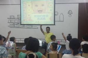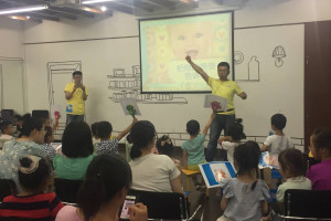 这次活动我们邀请到毛毛老师和其他两位老师。首先由三位老师带着大家跟着英文短片里的小朋友一起做热身操,小朋友和家长们都很积极地参与了进来。接着一名热情且表情丰富的男老师通过轻快、活泼、反复熟读及一问一答的方式让小朋友们记住表现情绪的英文单词,如“happy”、“sad”、“shy”、“surprise”等。活动最后,老师们还和家长们一起探讨在教育孩子过程中遇到的种种问题,分享育儿经验。