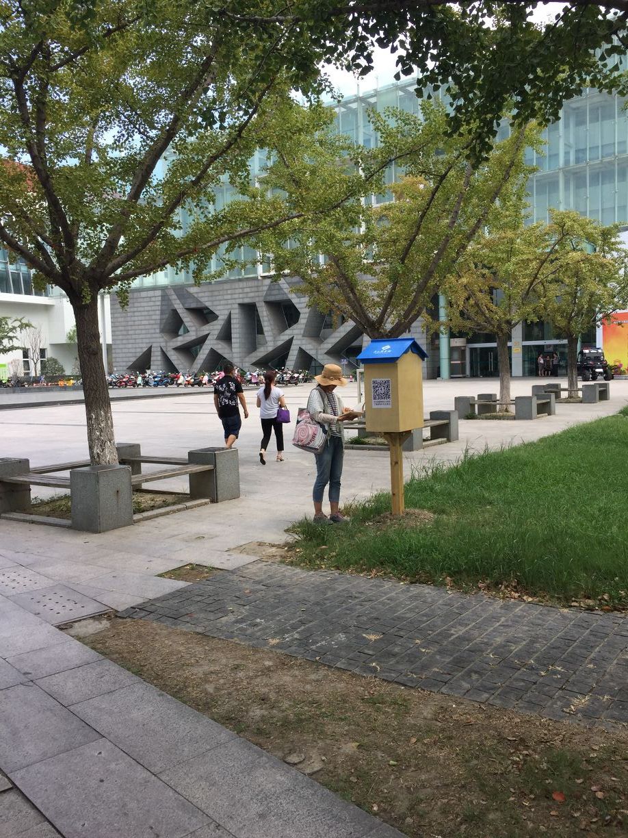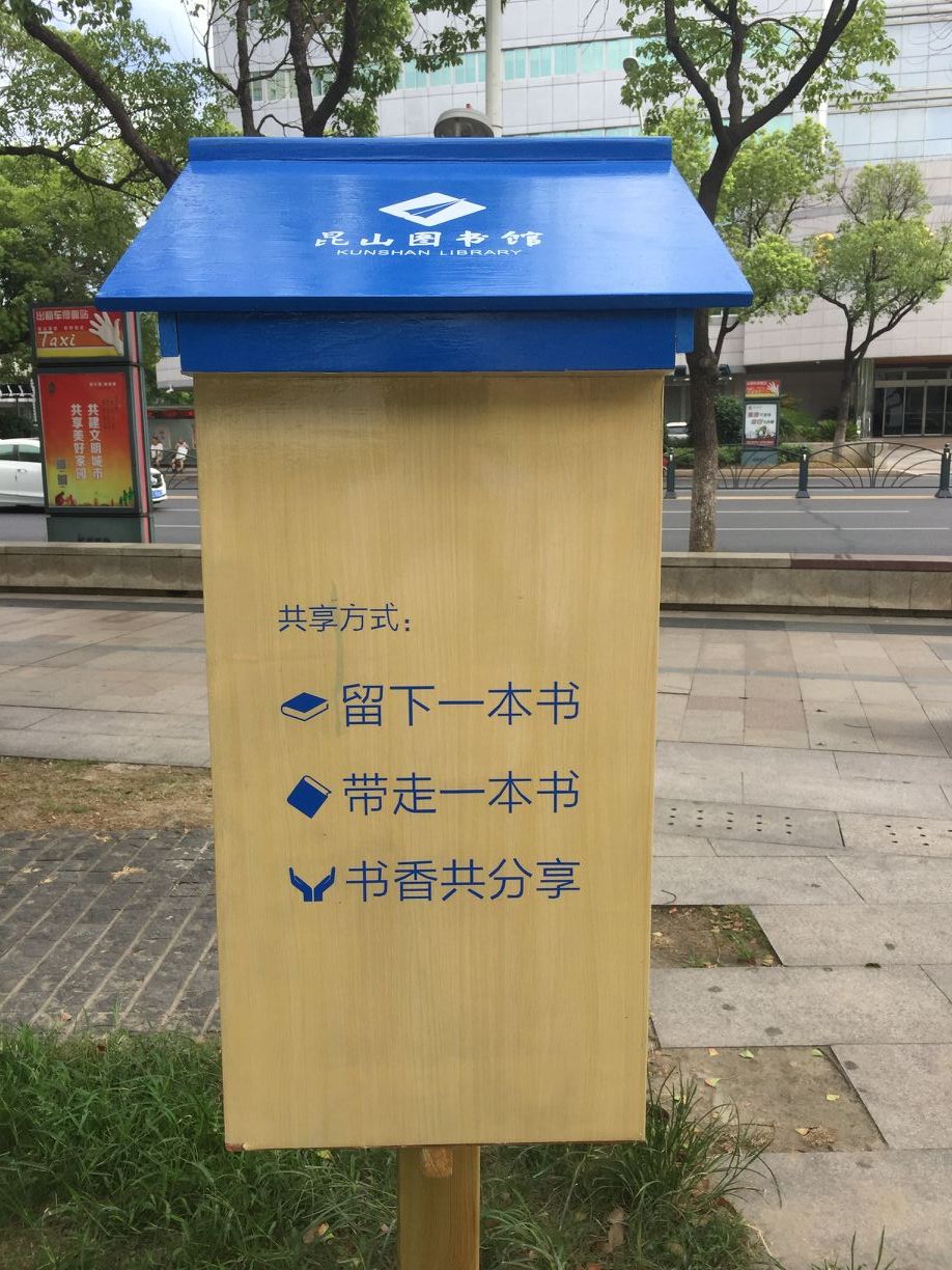 8月2日,昆山市图书馆建起了一家“共享书屋”。这个小小的“共享书屋”就是在图书馆北广场银杏树林中设置的一个书箱,头顶着一本打开的书籍,书箱打开,里面分上下两层,存放着近40本图书。市民朋友们可以就近随手取书,可以坐在银杏林边看书,亦或取回家阅览,看完换书或者还书即可。