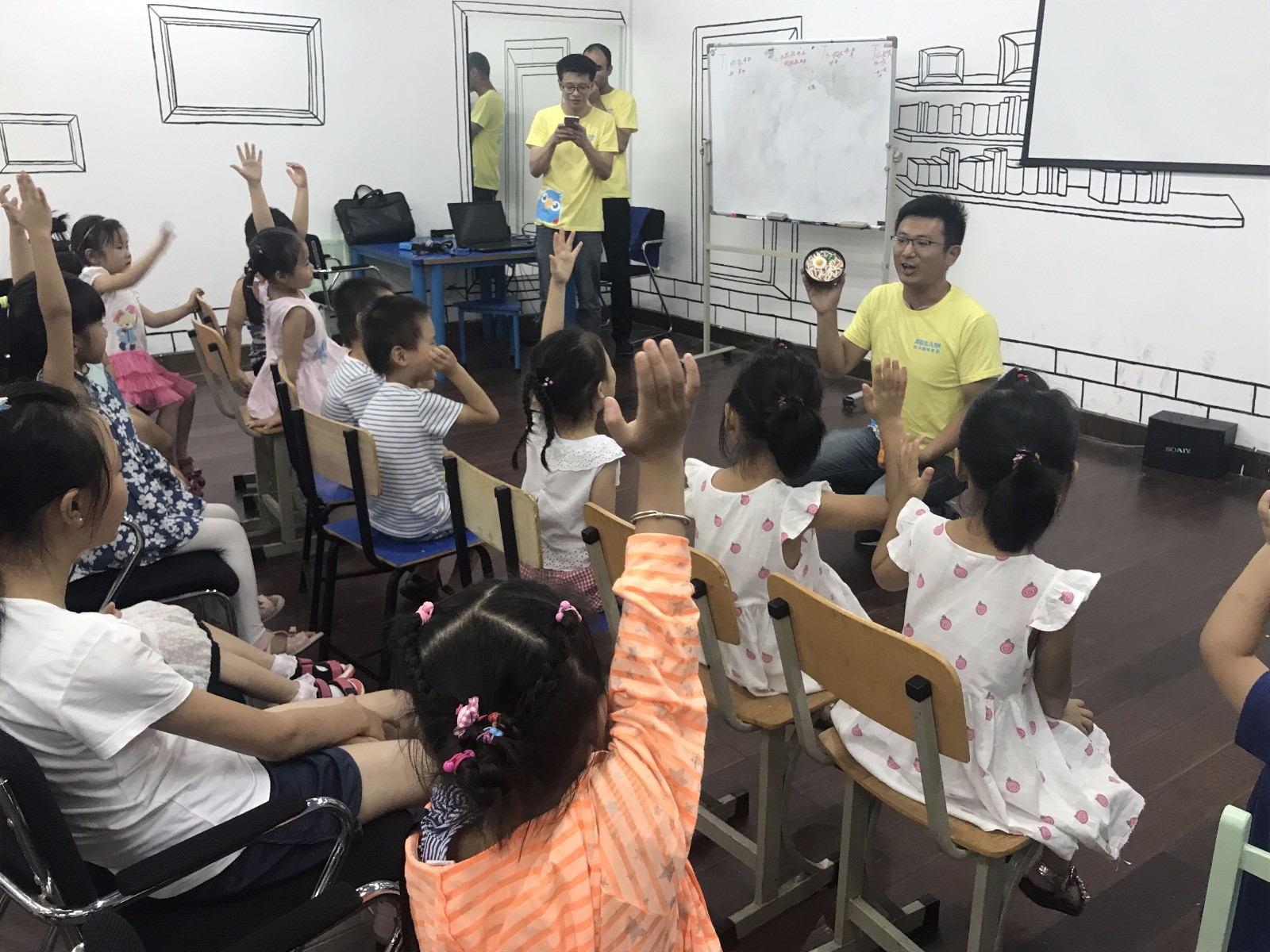 活动开场,萌萌的外教和助教老师就带着小朋友们来了一段热身舞,现场气氛瞬间活跃了起来,紧接着老师就拿出了今天的主要道具:形象超级逼真的食物!