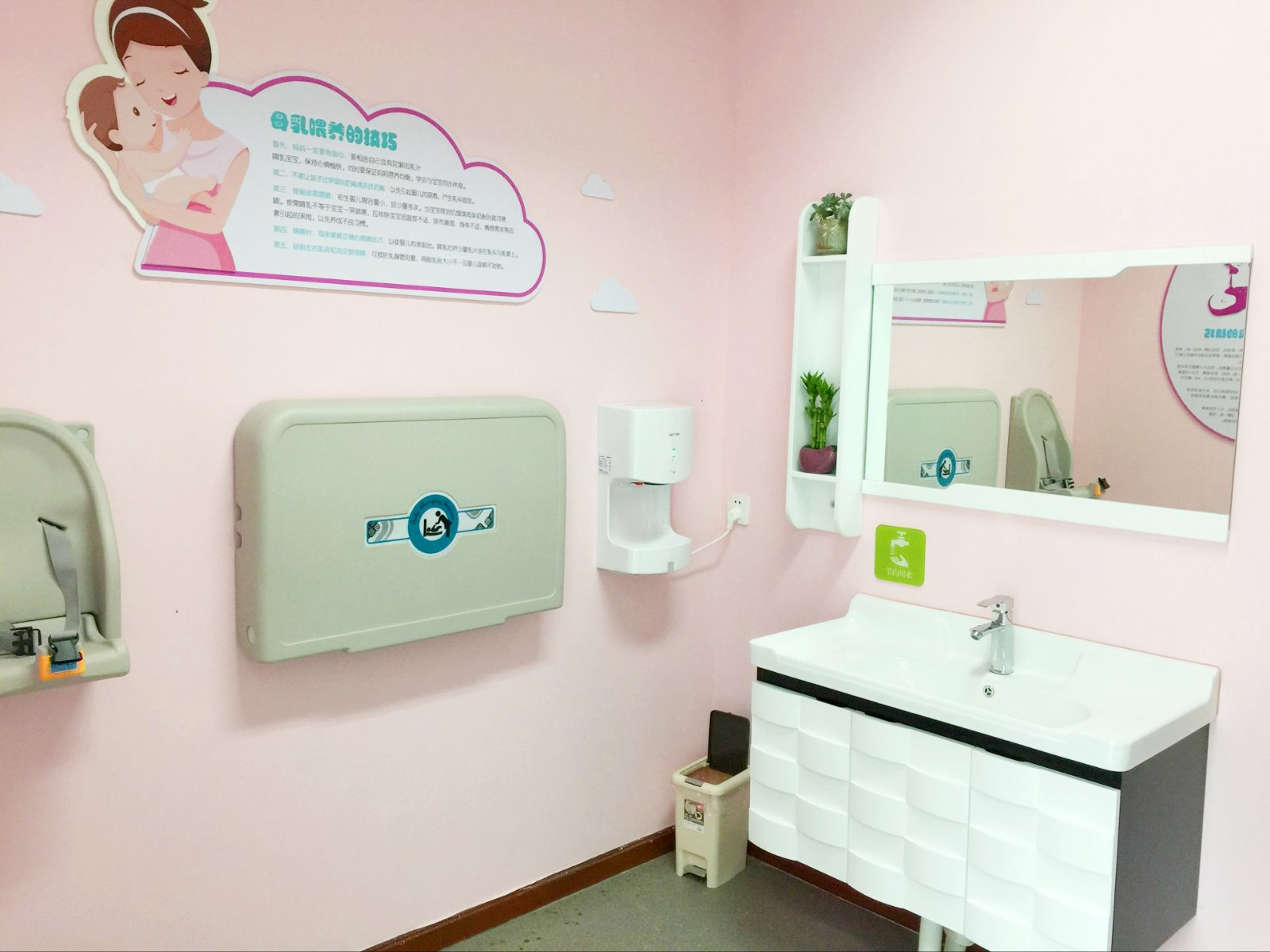 母乳哺育室位于少儿部内,是一个10平米单独的房间,内设妈妈哺乳椅、可折叠婴儿座椅、护理台、洗手池等,设计兼顾实用性、私密性、安全性、舒适性等要求。2017年8月30日母乳哺育室通过苏州妇联验收并正式对外开放。