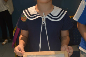 首先大家跟随讲解员来到博物馆活动室,开始解密造纸术。讲解员先跟大家介绍造纸术的由来及对人类产生的贡献,造纸术过程主要分为“浸泡”、“切碎”、“蒸煮”、“舂捣”、“打浆”、“抄纸”、“晒干”、“压平”,在介绍完相关步骤后,孩子们拿好博物馆准备好活动物料,开始动手造纸。