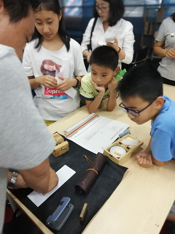 活动中吕昭成老师从篆刻印章的起源讲起,谈到我国最早的三枚印章、战国印章、秦代、汉代等各个朝代的印章以及两种刻印的方式铸印和凿印的特点,而后介绍了白文印章、朱文印章、帝王印章、艺术家印章,让小朋友从不同方面了解印章的知识及乐趣,最后吕老师带领小朋友体验印制书签的制作。