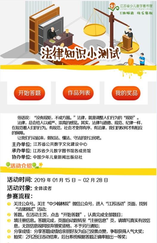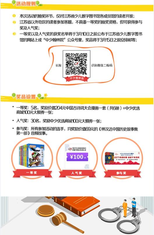 (3)一等奖以及人气奖的获奖名单将于3月10日之前公布于江苏省少儿数字图书馆的网站上或“中少翰林院”公众号里,奖品将于3月15日前安排邮寄。