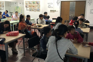 课程开始后,老师问了家长和孩子几个小问题,如“孩子最近最喜欢看的书”、“孩子最好的两个朋友名字”等,一起探讨了亲子阅读的重要性。在孩子与家长一起阅读《大灰狼学艺》故事后,老师要求大家分角色朗读并互相点评,孩子、家长都积极参与其中。