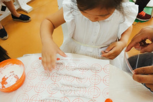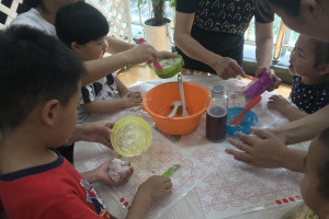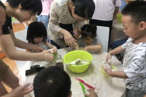 绘本分享后,老师为大家准备了紫薯汁,面粉,碗,硅胶垫,塑料刀。小朋友们,先用手去摸一摸,闻一闻,看一看,观察下面粉的特性,面粉是白色,无味,粉末状的。然后引导小朋友怎么将面粉变成面团,接着在已经放入面粉的碗中,加入紫薯汁,用塑料刀搅拌,让所有的干面粉都粘在一起,变成了面团。接着将面团放在硅胶垫上,小朋友用手压一压,按一按揉一揉,捏一捏来感受下这个面团。最后将面团分成一小份一小份的,用手搓一搓,搓成细细的,长长的面条。