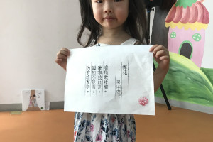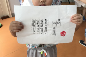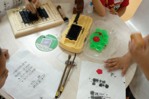 绘本分享后老师带领小朋友做了一个烛火实验,引导小朋友思考灭掉烛火的几种方法。然后老师为大家准备了宣纸,活字版,文房四宝,颜料,梅花印章。首先引导小朋友们怎么使用文房四宝,活字印刷,然后让小朋友自己体验磨墨,接着在活字版上刷上墨汁,最后将宣纸平整的铺在活字版上,用刷子轻轻地刷一刷,印好后,取出宣纸,最后用梅花印章印在作品上。