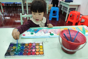 自我创作环节老师引导小朋友先用铅笔线条绘画自己心目中连绵不绝的山脉,然后借助勾线笔和水彩进行细节刻画,通过小朋友们绘画的这幅美妙的江南山水图歌颂祖国的大好河山,激发孩子们爱祖国的热情!