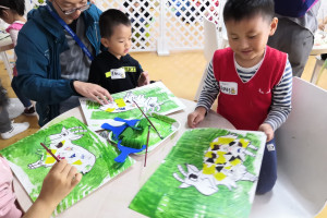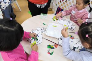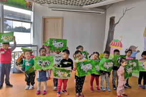绘本分享后,孩子们观察模型母鸡,一种头小、眼睛椭圆、嘴尖且硬、毛多而密又长的家禽。然后进入手工环节:首先分发布料、剪刀、山羊模型,给山羊做一件破破烂烂的衣服;接着分发滚筒刷、绿色颜料、卡纸,画上绿绿的草地,最后将山羊放到绿绿的草地上。