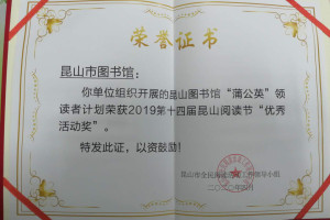 在评选中,昆山市图书馆荣获2019年度昆山市全民阅读先进单位,组织开展的“蒲公英”领读者计划荣获“优秀活动奖”,李青荣获昆山市全民阅读先进个人。