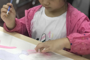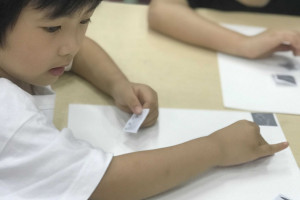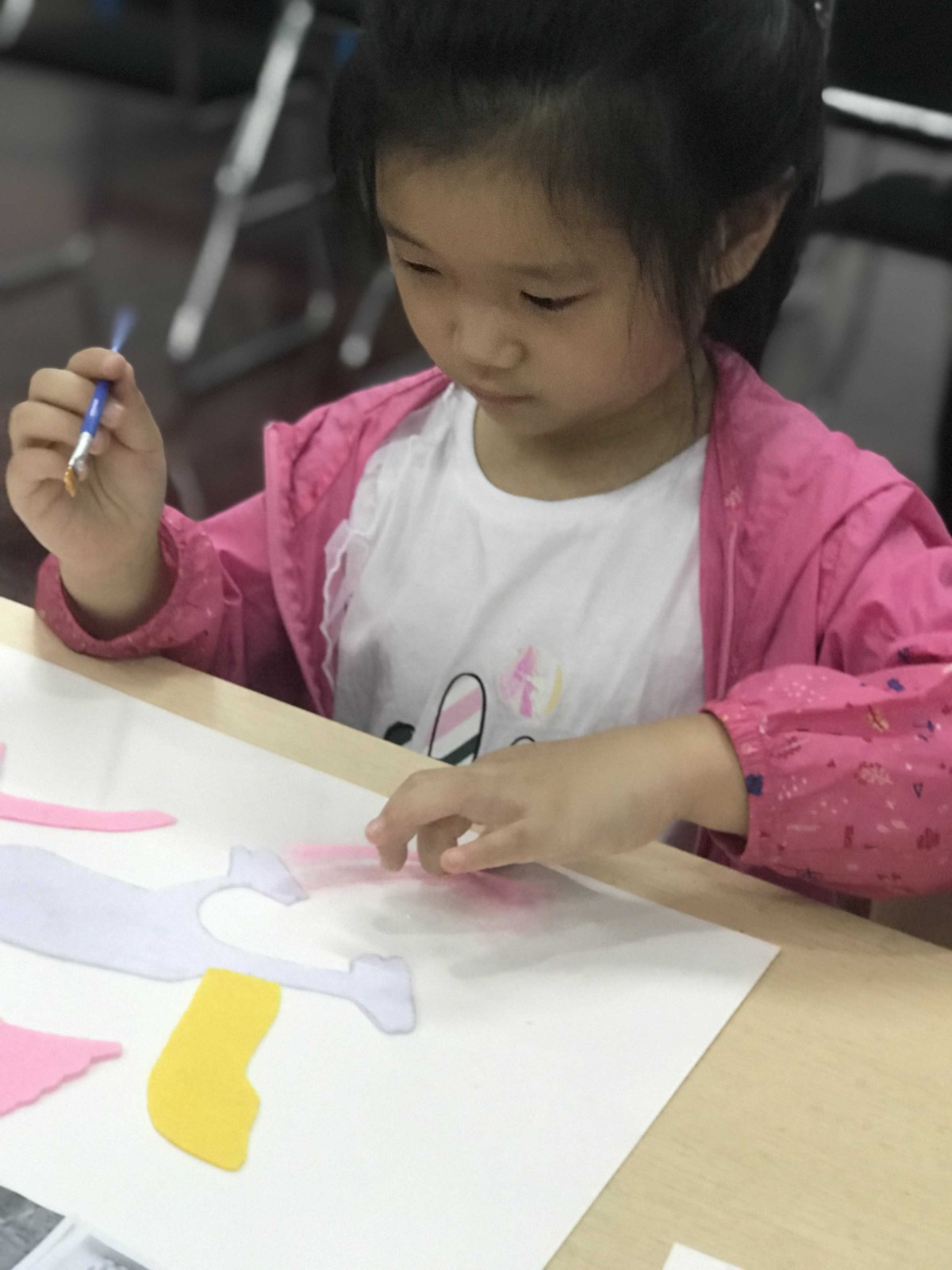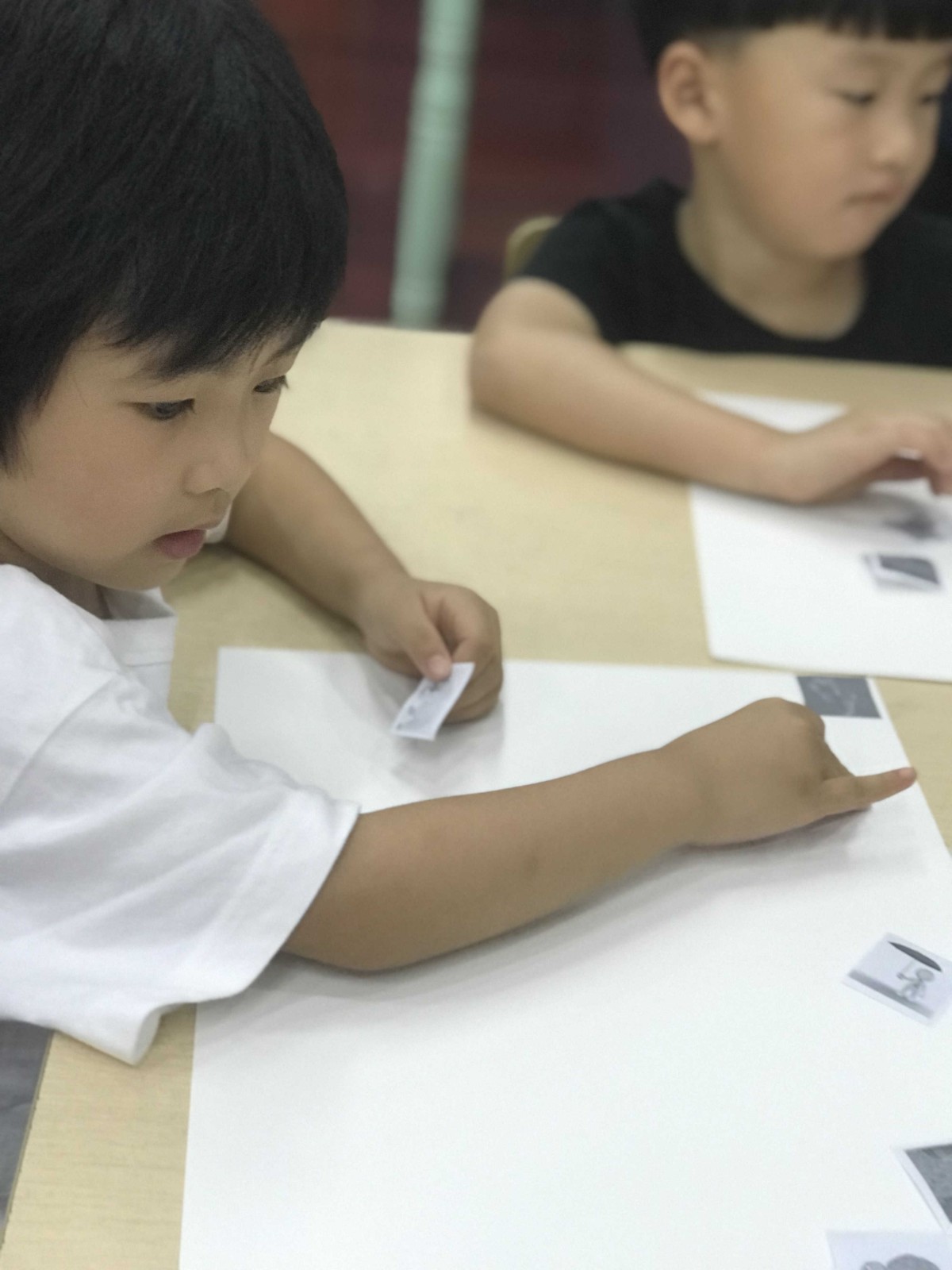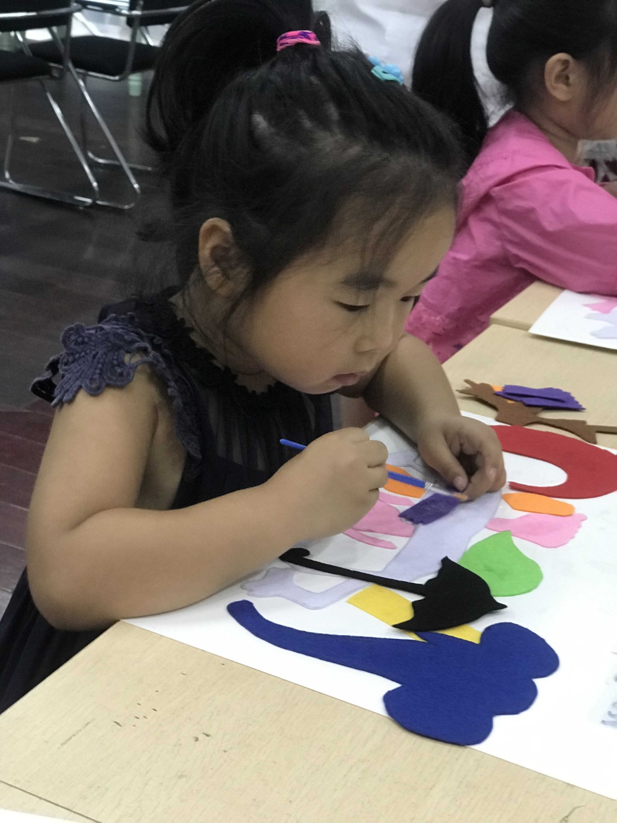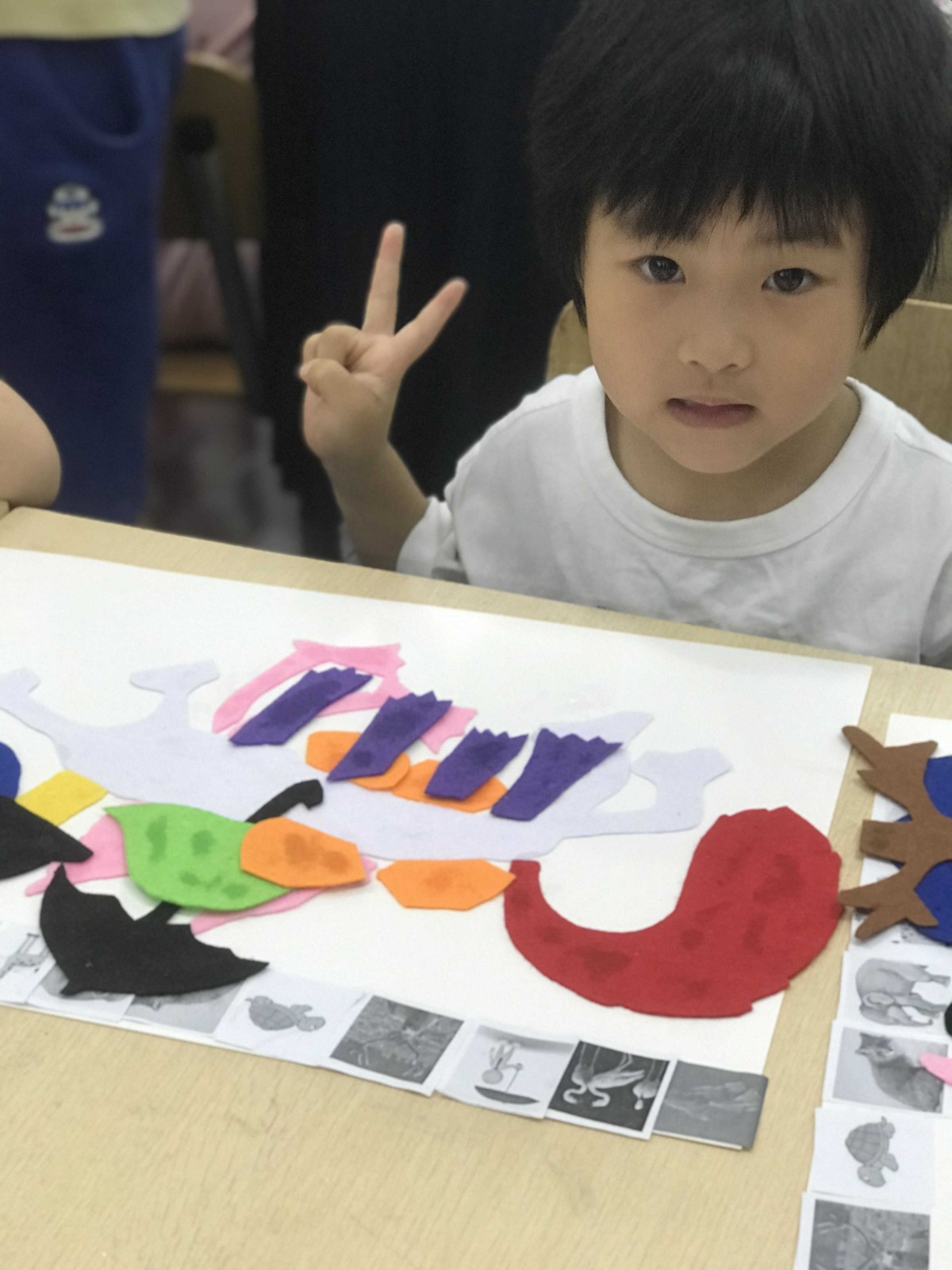 绘本分享后老师准备了动物们的图片,并按照颜色的顺序依次认知各种动物,并重点介绍动物特征。老师给出颜色引导词,小朋友按照颜色顺序将图片拍成一排;分发A3白色硬卡,将动物图片们粘贴固定在硬卡的上方或下方,最后老师为大家准备了不织布粘贴材料包,给足够的时间让小朋友们拼装成变色龙,将拼装好的混合变色龙固定到硬卡中间;完成作品后,他们为自己拥有一张拼拼凑凑的变色龙而开心。