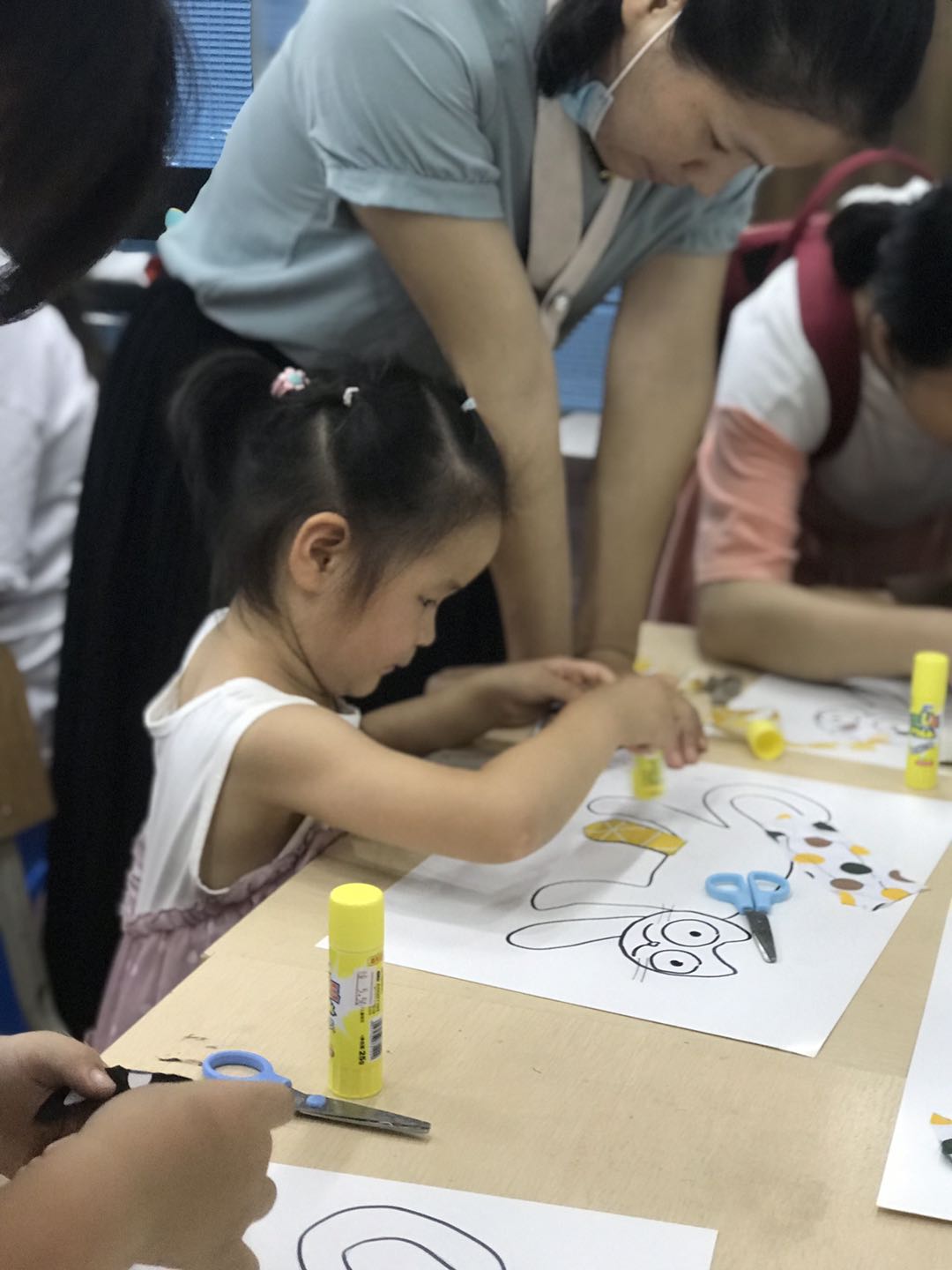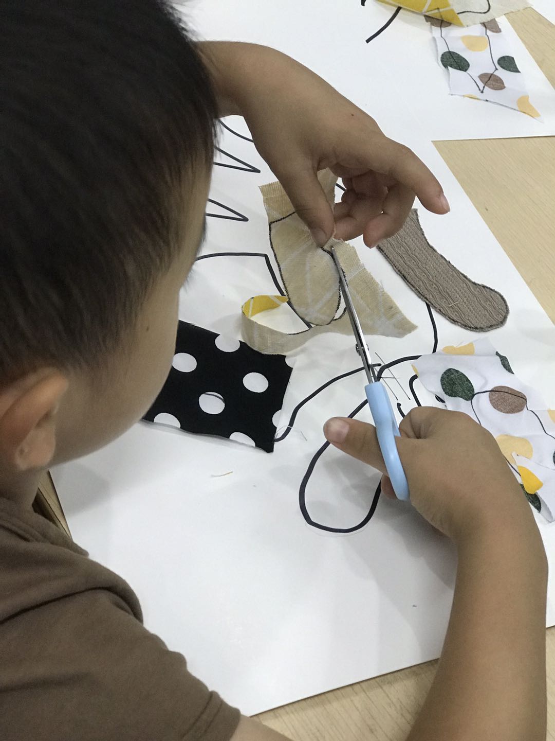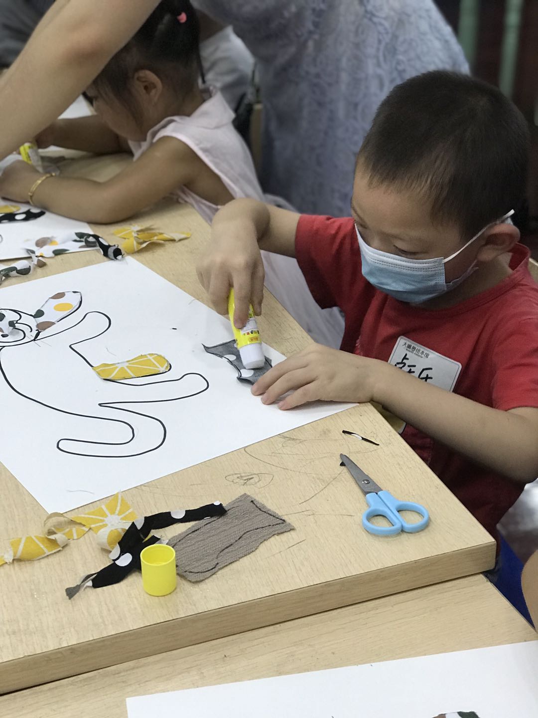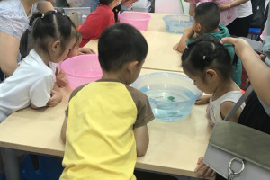 绘本分享后老师给每个小朋友准了用脸盆装的水,引导小朋友观察水中的自己和灯光,并用问题引出孩子们的观察方向:“你们能看清水中的自己吗?”“水中的自己是清楚的还是模糊的?”让小朋友了解光的折射现像。绘制时间分发猫各个部位在不同动物眼中的色彩的布料,再分发有猫的模版的A3白色硬卡,剪刀,胶棒,将猫的不同部位对应的色彩的布料,剪好,粘贴完成,最后呈现出每个不同动物眼中的不同的猫的样子。小朋友会一起和爸爸妈妈分享自自己的作品。