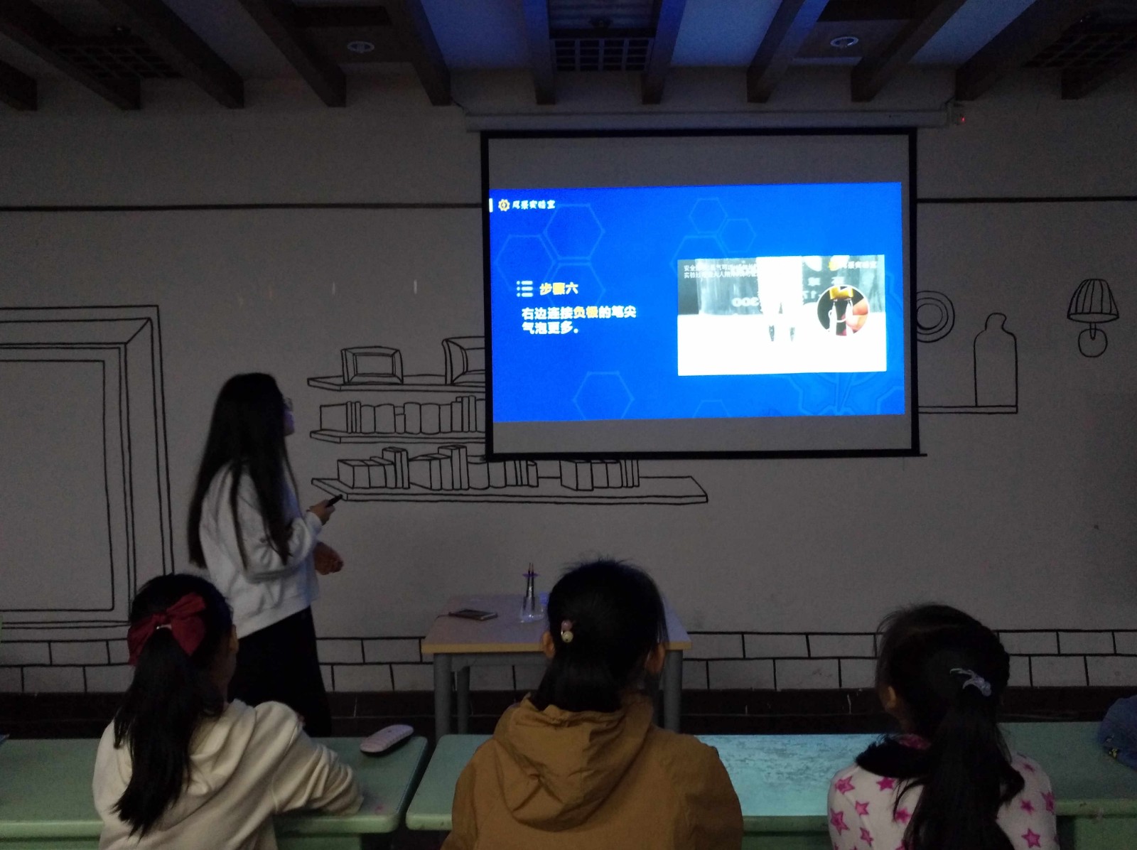 第一个实验是电解水,由于实验会产生部分易燃气体——氢气,因此仅由老师在台上进行操作演示,并随机邀请小读者们上前观察实验现象。实验中老师在水中加入小苏打来提高导电性,并由此引入知识点,向小读者们普及了生活中常见的导电体及水能导电却不是导体的原因。