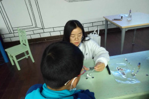 最后一个实验有点难度了,需要小读者们弯折铜丝形成一个固定的形状,小读者们发现,心中想把铜丝掰成直角,可手却不听话,一顿操作过后,小读者手中的铜丝形状各异,还有的十分扭曲,通过老师的指导与调整,还是达到了实验效果。铜丝底部弯折成的四边形恰好可以夹住磁铁,顶部的铜丝结又连接了电池的一极,电流在铜丝中流动,受到洛仑磁力的影响,铜丝飞速旋转,自制小电机开始运转了,小读者们惊奇万分。