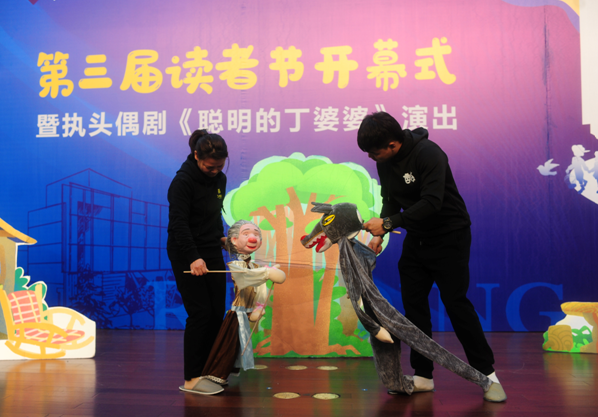 开幕式后,微剧团的老师们为现场的观众带来《聪明的丁婆婆》执头偶剧演出。演出通过人与偶巧妙结合的表演方式,以活泼多变、充满想象力的舞台效果为大家演绎了一个机智幽默的童话故事,赢得观众的阵阵掌声。