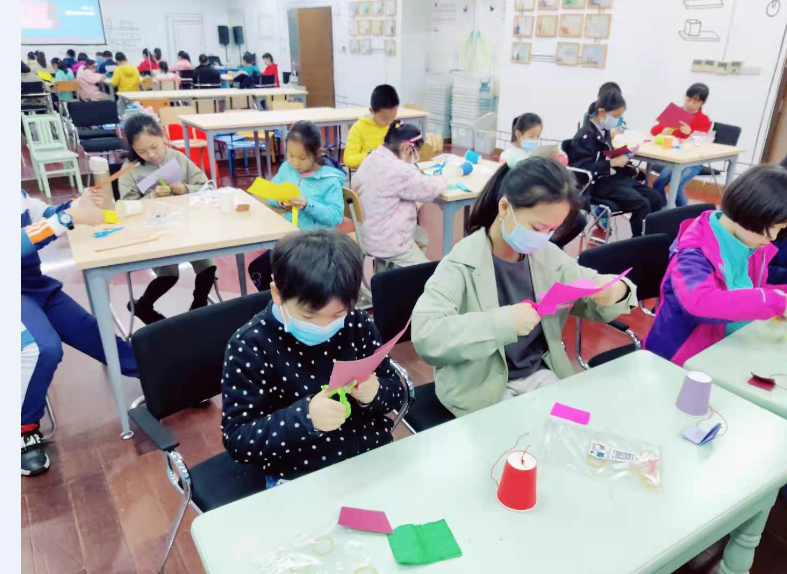 待现场气氛稍微冷静下来,老师又对声音的最后一个要素“音色”进行了讲解。不同的发声体由于其材料、结构不同,振动发出的基音及泛音不同,因此声音的特色也不同。人声分中、高、低音,器乐又分为弦乐、管乐以及打击乐等多种类,活动现场小读者们用硬卡纸及橡皮筋自制了小吉他,通过弹拨橡皮筋发出的声响进一步了解到吉他的发声原理:手指拔动琴弦,琴弦开始振动,并传给琴码和面板。面板与琴身的共振压缩共鸣箱里的空气振动产生声波,声音便通过背板的反射从音孔传出。小读者们收获颇丰。