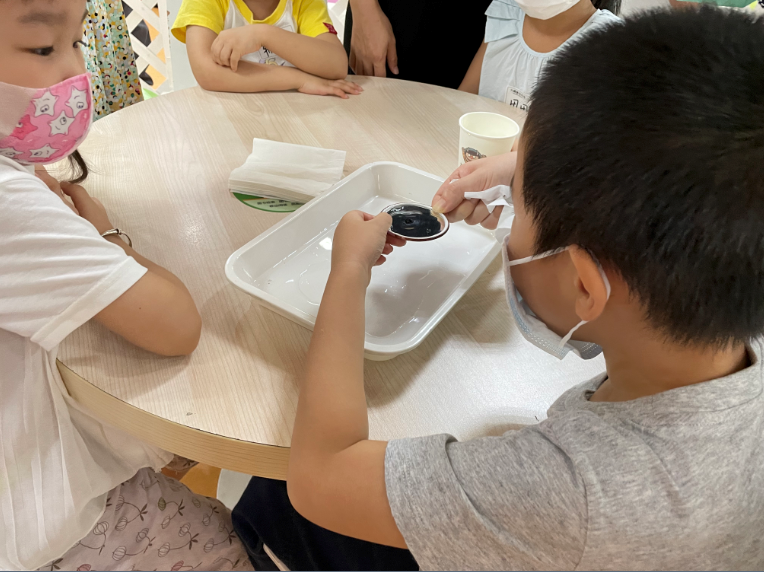 绘本分享后让小朋友一起完成跃动的祝福实验,让小朋友了解白板笔漂浮字的原理。白板笔的墨水中添加了降低附着力的“剥离剂”。墨水凝固后形成一层薄薄的粘膜,极易与玻璃等光滑表面分离。因为墨水的密度比水小,图案就漂浮在水面啦。在老师的指导下,小朋友们自己制作了一幅属于教师节的礼物,并给家长展示自己的作品,让小朋友表达尊师重教的情感。