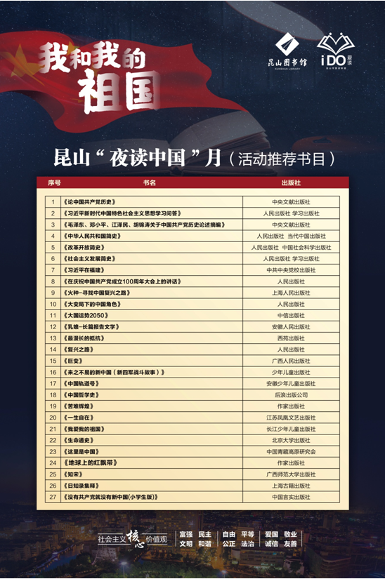 本次活动主题为“我和我的祖国”,全市共组织21项活动,夜读采用诗会、读书分享会、讲座、亲子活动、经典诵读等多样形式,广大读者及阅读组织可根据昆山市图书馆推荐的中国经典文化著作及红色书籍开展夜读。活动现已开启H5线上参与展示平台,读书组织及个人可通过微信端上传夜读照片,分享读书心得,共建书香城市。
