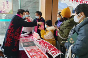 年节里,除了门上喜庆吉祥的春联,还少不了美丽的窗花。窗花是我们中国传统的民间艺术,是一种镂空艺术,其在视觉上给人以透空的感觉和艺术享受。民间艺人刘彦英老师给读者示范剪窗花,一把剪刀,一张红纸,伴随着 “咔嚓”声,栩栩如生的小兔子、福字、“春”字……一张张寓意美好、风格独特的窗花活灵活现地展现在读者面前。许多读者围在民间艺人刘彦英老师身边,聆听着窗花文化,观看刘老师剪窗花的过程,欣赏大幅“民族情 心连心”“祖国风华正茂”等剪纸作品,惊叹于窗花这门传统艺术的魅力,对传统文化产生了浓浓的兴趣。