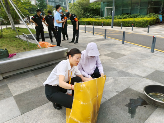 疏散演练结束后进行了灭火毯的使用培训。在由姜顾问讲解完消防器材的使用方法后,馆员们按照灭火流程使用灭火毯对训练用火源进行扑灭,完成了灭火毯使用培训。