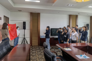全体党员佩戴党徽、面向党旗,在领誓人的带领下,举起右手庄严宣誓:“我志愿加入中国共产党,拥护党的纲领,遵守党的章程……”,全体党员神情肃穆、声音洪亮,在重温入党誓词的同时,牢记责任担当,永葆前进初心。