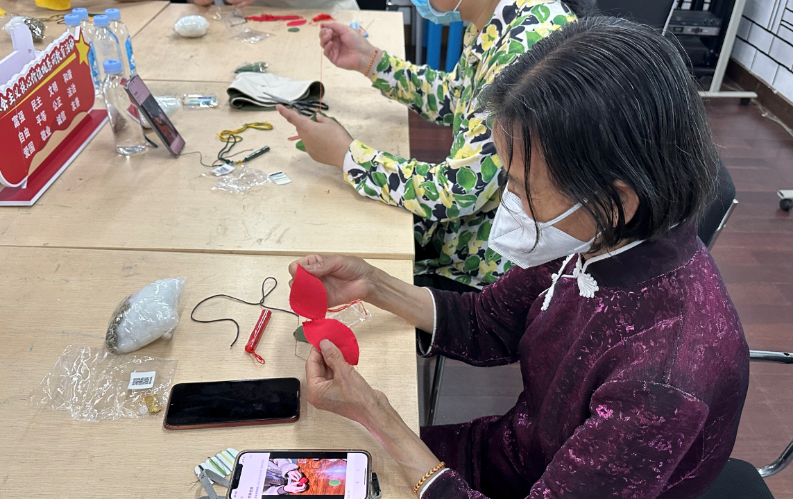 活动中,各位老年读者发挥自己的动手能力,在工作人员的指导帮助下进行缝制。其中高奶奶和曾奶奶的手工功底最为突出,很快就缝制出两个梨形的香囊。大家在制作过程中互帮互助,完成作品后互相展示。不同形状的香囊有着不同的寓意:“好运连连”、“事事如意”、“平安喜乐”、“好事顺利”。大家通过一个小小的香囊,表达着对生活的美好祝愿。