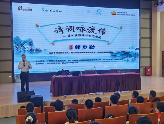 活动中,昆图朗诵团副团长郭步勤老师从什么是朗诵、古诗词的朗诵特点,并以《枫桥夜泊》、《望庐山瀑布》、《过故人庄》三首古诗词为例给同学们讲解如何朗诵古诗词。