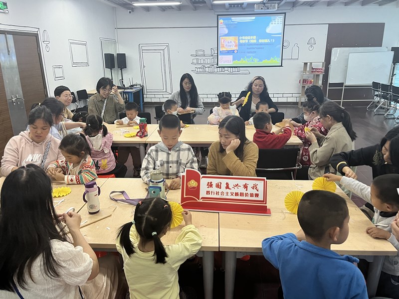 手工环节:制作一束美丽的鲜花献给妈妈,孩子们在家人的陪伴下一边做手工,一边回顾着故事内容。