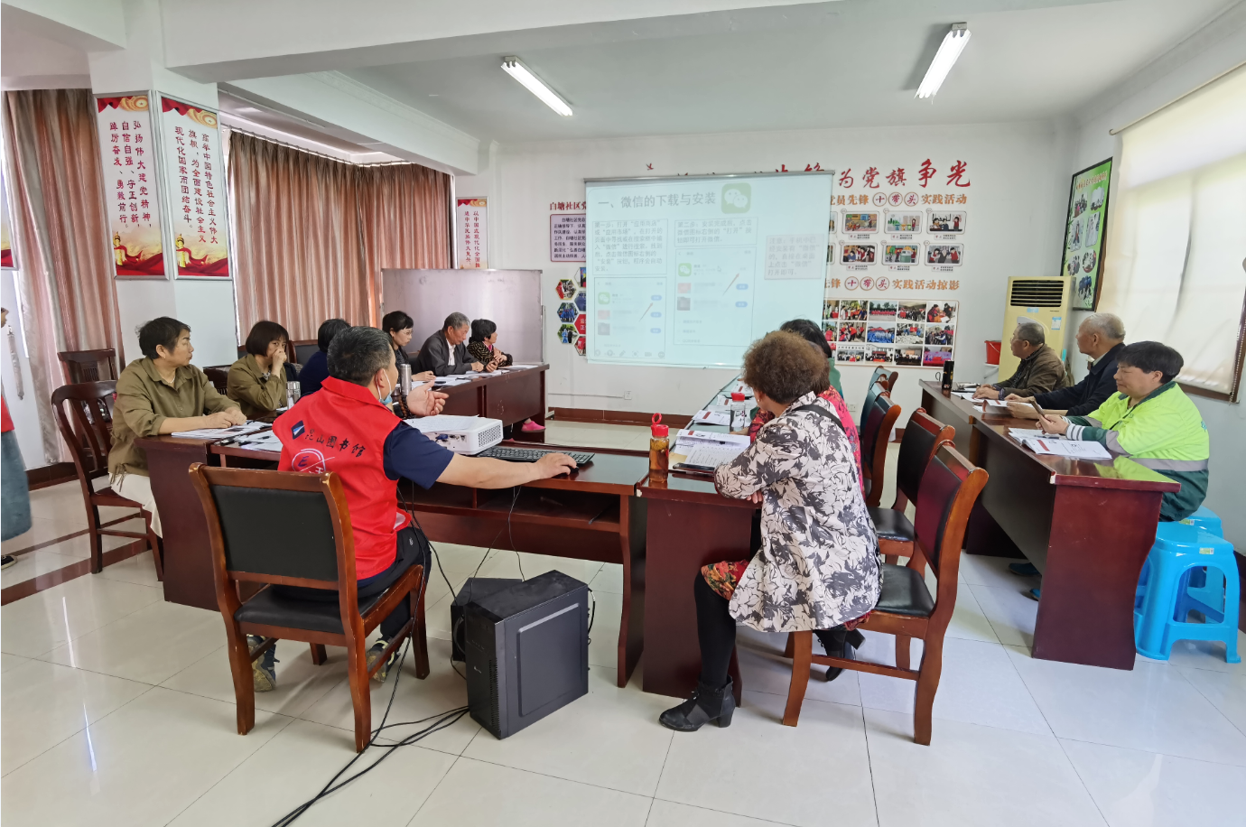 经过银和社区前期进行的活动宣传、学员招募等一系列前期筹备工作,活动当天由二十多名社区老年居民参加了首场活动。志愿者将印制好的课件和笔记用笔发放给每位老年学员,便于学员回去后巩固练习所学内容,做到真正的会学会用。