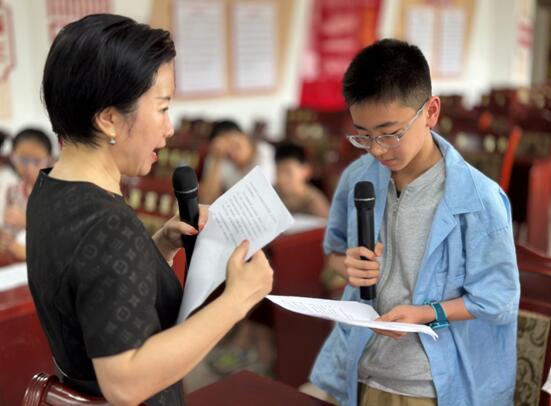 古诗词是中华民族文化园中经久不衰的瑰宝,在朗诵中体会作品要表达的思想、感情,感受作品的意境、韵味,学好古诗词,能够更好的继承和发扬中华优秀传统文化。郭步勤老师以“经典咏流传”——古诗词朗诵赏析为主题,从什么是朗诵、为什么要学习朗诵、什么是好的朗诵三方面层层深入递进、由浅入深,让孩子对朗诵有了初步概念。徐婷老师以“品唐诗宋词 读大美昆山”为主题, 通过口部操+气息训练,进行了有声语言开口前的专业热身运动、给孩子们讲述了《李清照 裙子换书》的故事,让孩子们了解如何准确、生动的理解并讲好故事。