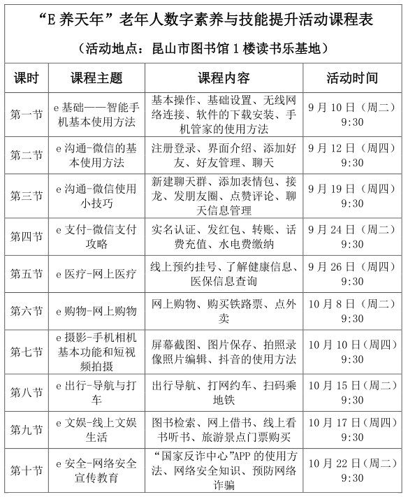 为弘扬中华民族敬老爱老的传统美德,满足老年人学习智能手机的需求,进一步提升老年群体的数字素养与技能,助力他们跨越数字鸿沟,共享智慧生活,昆山市图书馆“E养天年”老年人数字素养与技能提升培训活动秋季班现在开始招募学员,感兴趣的朋友们快来报名吧!