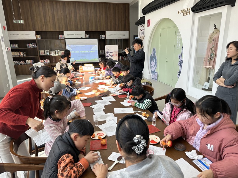 2025年2月9日,昆山市图书馆非遗分馆内热闹非凡,非遗拓印体验活动在此举办,吸引了众多小朋友们的积极参与。
