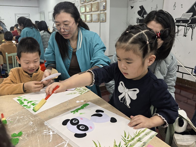 在创意拼贴画环节,小朋友们运用黑色、白色不织布,精心贴出各具特色的大熊猫。通过拼贴创作,小朋友们不仅锻炼了手眼协调能力,更将对熊猫的喜爱与理解融入作品之中。
