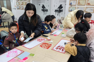 手工环节,孩子们化身“小小版画家”,用版画拓印技术制作专属日历。他们先在吹塑板上刻出元旦元素——有的画烟花,有的刻灯笼,再蘸取各色颜料,小心翼翼地在卡纸上拓印。当图案清晰呈现时,孩子们惊喜地欢呼起来,最后认真标注日期,完成了一幅幅充满童趣的元旦日历。