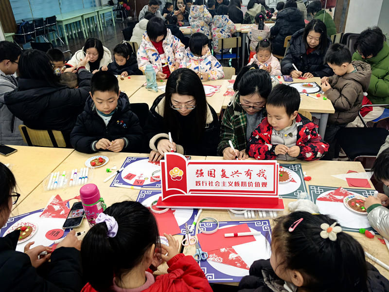 最热闹的环节当属腊八粥手作体验。孩子们用彩笔给纸盘设计精美的图案,再以彩色粘土模拟糯米、红豆、花生等食材,精心“熬制”属于自己的腊八粥。亲子协作间,一幅幅充满童趣的作品逐渐成型,既有传统节俗的韵味,又充满现代创作的奇思妙想。