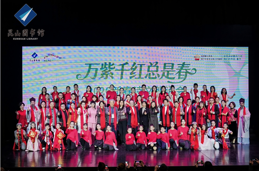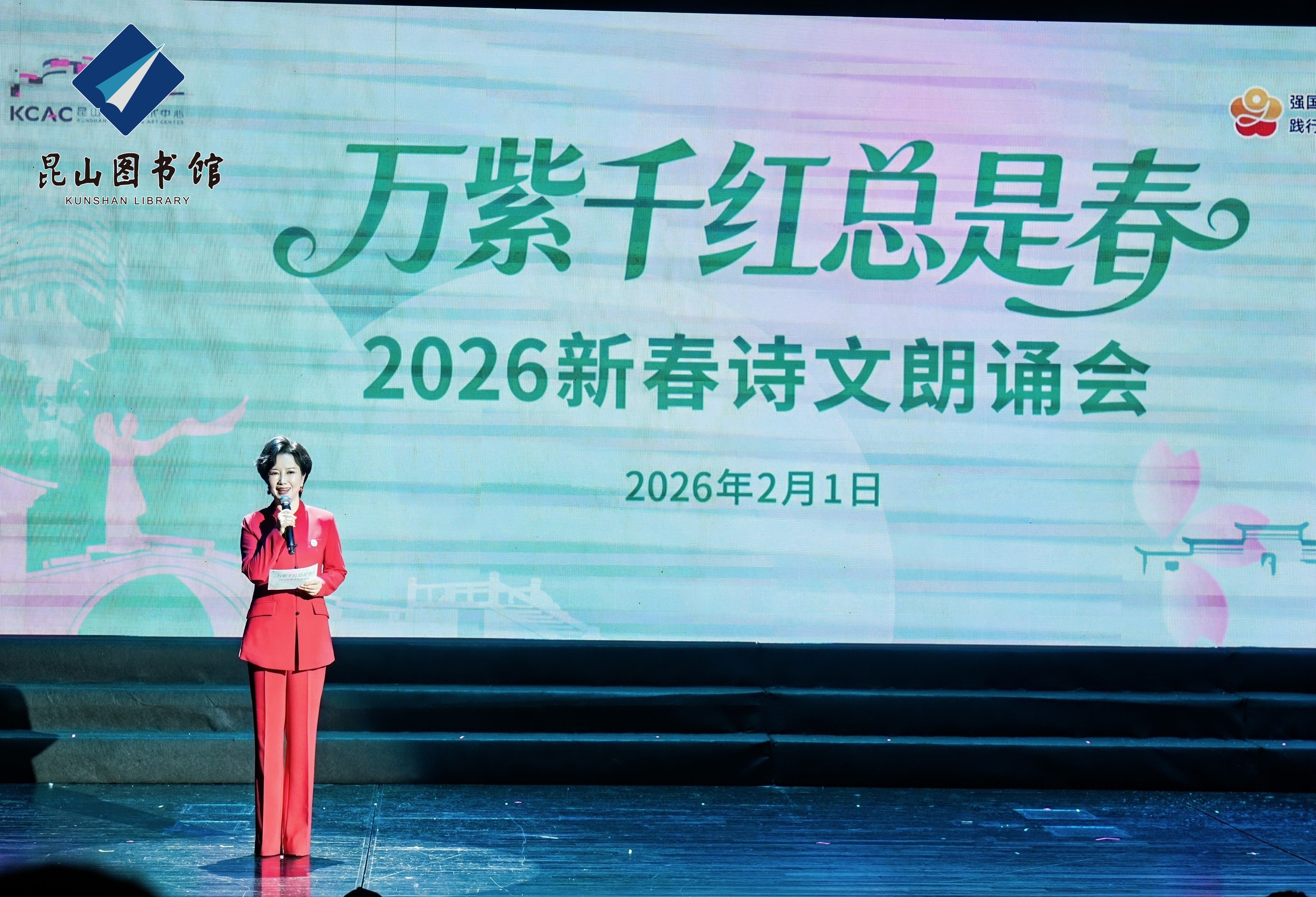 策马迎春,阅享新年。2月1日晚,恰逢《全民阅读促进条例》正式施行,“万紫千红总是春——2026新春诗文朗诵会”在昆山文化艺术中心举行。活动由昆山市文体广电和旅游局、江苏省朗诵协会共同指导,昆山市图书馆主办。朗诵会以诗意盎然的艺术形式,为广大市民献上了一场融合经典与现代、贯通人文与科技的新春文化盛宴。昆山市文体广电和旅游局党组副书记、副局长郁新,昆山市社科联主席顾彩芳,昆山市文联副主席、中国作协会员、“外卖诗人”王计兵等领导和新就业群体代表、朗诵爱好者们观看了演出。