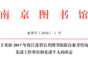 我馆荣获2017年度江苏省公共图书馆联合参考咨询网先进工作单位和先进个人表彰