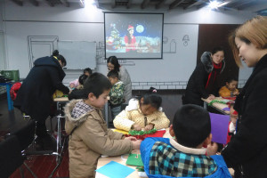 讲完了绘本,老师给小朋友分发圣诞帽、彩纸、剪刀等,请小朋友自己设计圣诞帽。在欢快的圣诞歌曲中,家长孩子齐动手,小朋友发到的糖果,糖果吃完剩下的糖纸也成了装饰物,孩子们创作了属于他们自己的独一无二的圣诞帽。