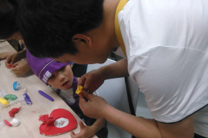 很多家长和孩子们早早就赶到了现场,老师为每个孩子发了个一顶紫色的帽子、一件紫色的围兜、一套材料工具。活动开始,老师给大家讲解,并教大家用超轻土制作装饰物康乃馨。接下来大家在空白爱心相框上自由发挥动手制作。擀平、撕、剪、捏……,超轻土将爱心相框装饰得漂亮极了。蝴蝶、鲜花、爱心、鲸鱼……,包含了孩子对妈妈深深的爱。活动现场气氛高涨,爸爸们拿出手机记录下孩子将独一无二的爱心相框献给妈妈的温馨画面。