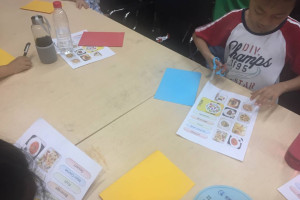 这次活动我们邀请到绘本树英语的两位老师为小朋友授课。活动开始后,老师先带着大家跟着短片里的小朋友一边做操一边念“How are you?”。这次活动的主题是关于美食的,老师通过反复熟读的方式,使小朋友们掌握了“appetizer”、“main course”、“beverage”等与西餐有关的知识。接着老师给小朋友们发放了手工材料,让大家制作属于自己的美食菜单,加深了对知识的理解。