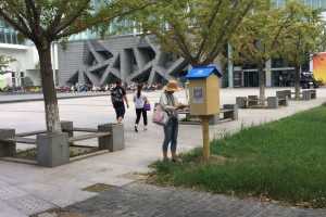 8月2日,昆山市图书馆建起了一家“共享书屋”。这个小小的“共享书屋”就是在图书馆北广场银杏树林中设置的一个书箱,头顶着一本打开的书籍,书箱打开,里面分上下两层,存放着近40本图书。市民朋友们可以就近随手取书,可以坐在银杏林边看书,亦或取回家阅览,看完换书或者还书即可。