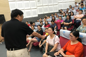 讲座中,周老师先从江苏的高考趋势讲起,从宏观上对学生的作文写作进行了指导,接下来从具体问题入手,结合自身多年作文教学的经验,为家长及孩子们提供了可行性非常强的指导意见。他认为作文写作应从六大块入手,分别为:比较、分析、联想、功用、评论、描述。然后周老师通过讲解例文,进行深入浅出的分析,认为如果能把这六大形式应用于写作当中,经过不断地练习,作文写作水平必然会有所提升。
