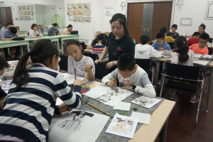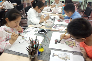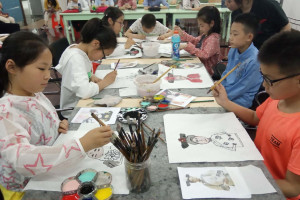 在活动后期人物创作中用到了水墨的形式,用勾线笔勾勒基本造型,彩墨画出漂亮的色彩和装饰。毛笔的运用大家基本都能掌握,部分小朋友不能很好的掌握毛笔的运用,线条不够流畅需要继续加强锻炼。各种颜色的搭配和毛笔墨色的运用让孩子们的作品丰富而有趣。