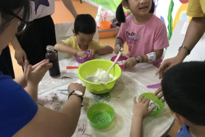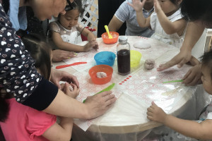 绘本分享后,老师为大家准备了紫薯汁,面粉,碗,硅胶垫,塑料刀。小朋友们,先用手去摸一摸,闻一闻,看一看,观察下面粉的特性,面粉是白色,无味,粉末状的。然后引导小朋友怎么将面粉变成面团,接着在已经放入面粉的碗中,加入紫薯汁,用塑料刀搅拌,让所有的干面粉都粘在一起,变成了面团。接着将面团放在硅胶垫上,小朋友用手压一压,按一按揉一揉,捏一捏来感受下这个面团。最后将面团分成一小份一小份的,用手搓一搓,搓成细细的,长长的面条。