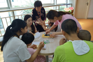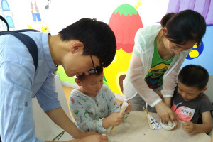 绘本分享后,老师为大家准备了,研磨棒,研磨碗,扇子白坯,文房四宝,大嘴兽绘本馆定制印章。首先引导小朋友如何使用文房四宝,接着用毛笔蘸上磨好的墨汁,在扇子上画出桃枝。后面让小朋友体验研磨的过程,将提前准备的粉色康乃馨放入研磨碗中进行研磨。接着用画笔两支,蘸取已经研磨好的花汁相互敲击,将花汁洒落在扇子上,最后盖上定制印章。