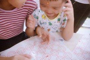 绘本分享后,让小朋友们观察彩色的玻璃纸,引导他们可以用两种颜色玻璃纸叠加,会奇特的显示出另外一种颜色:红+蓝=紫.红+黄=橙.蓝+黄=绿;接着在圆圆卡纸的月饼上自由绘画,然后贴上彩色的玻璃纸。既可以通过玻璃纸看月饼上字不同的颜色变化,也可以通过月饼上的玻璃纸看看外面的世界,发现周围的颜色都变化了。最后小朋友们一起做冰皮月饼,小朋友们吃上自己做的月饼,开心极了!